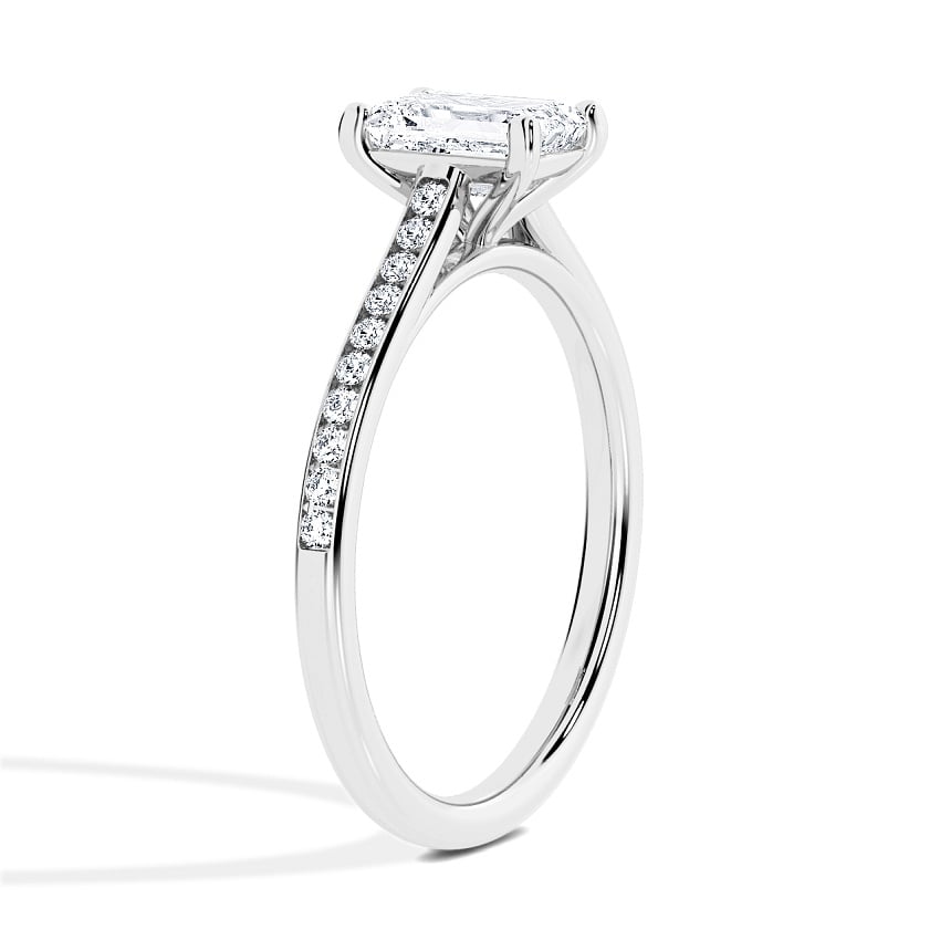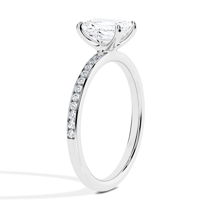 An emerald cut engagement ring includes a diamond (or other gemstone) with an elongated rectangular shape and rounded corners. Emerald cut diamonds typically have 57 linear facets, which creates flashes of light and showcases the gorgeous clarity and color of the stone. While emerald cut engagement rings were a popular choice during the Art Deco and mid-century modern periods, they remain a timeless choice for an exquisite symbol of love.