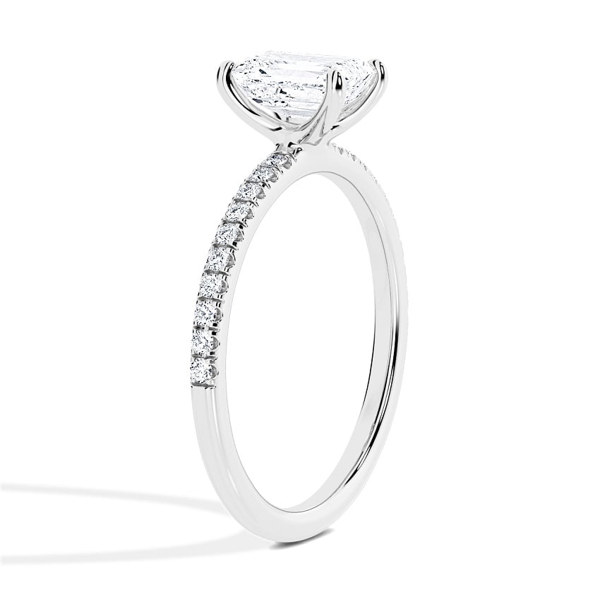 A simple wedding band with a matching precious metal goes best with emerald cut engagement rings. Slim and dainty bands put the emerald cut on full display, making them a popular, budget friendly option.