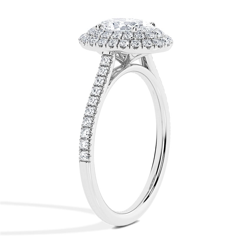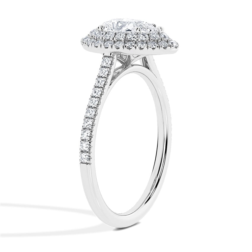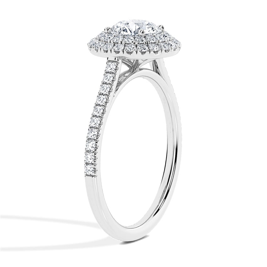 Halo engagement rings are a special type of setting that includes a center stone encircled by a ring of tiny diamonds forming a halo. Halo engagement rings can have a single, double, or hidden halo, which is when the halo sits below the stone rather than around it.