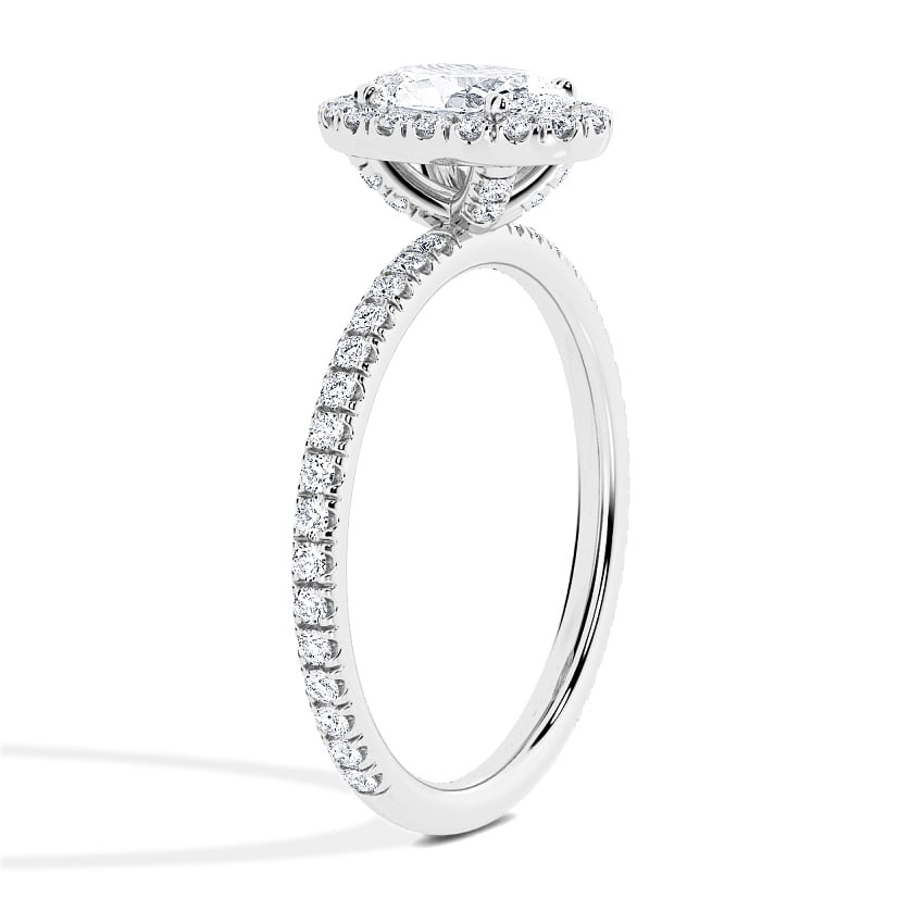 Halo rings can feature a traditional single or enhanced double halo, which adds a second layer or tiny gems that wrap around the center stone. Hidden halos are also very common for engagement rings, which feature a small band of diamonds under the center stone, as opposed to wrapping around it. This effect gives the middle diamond a floating appearance, while all halo settings dramatically increase the sparkle of an engagement ring.