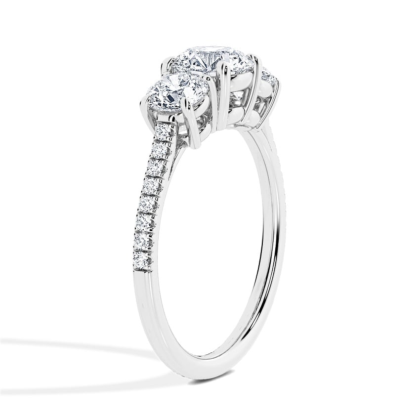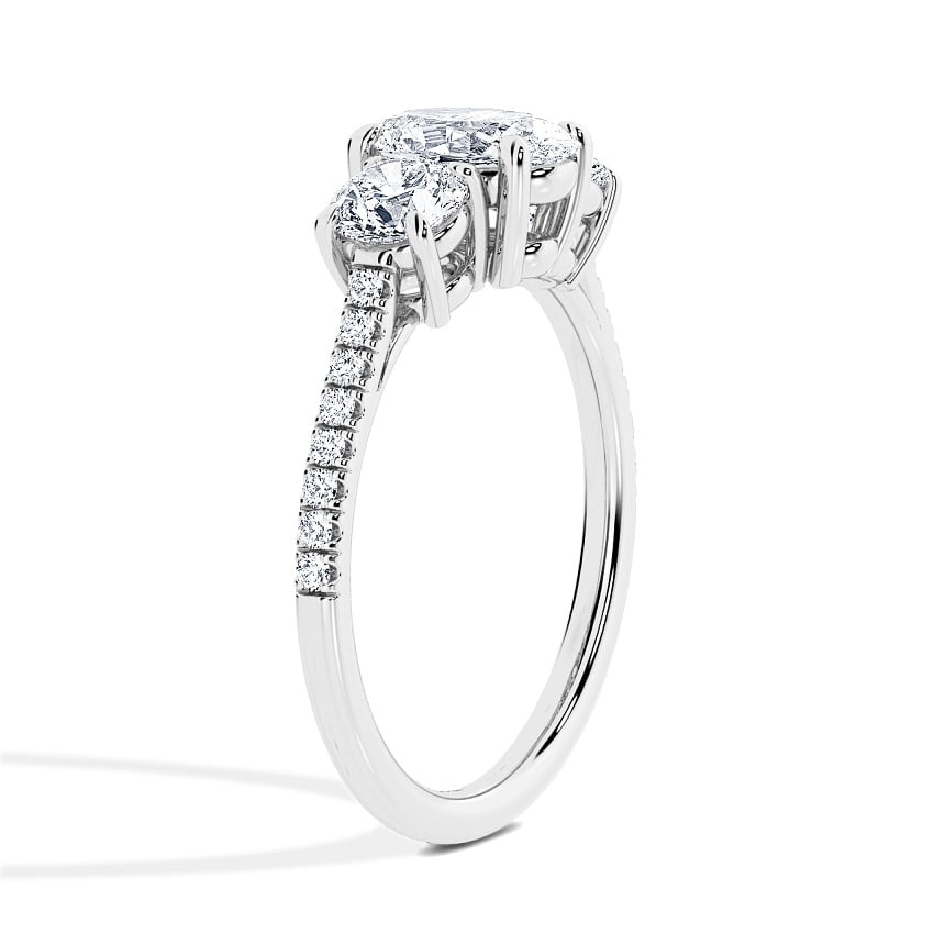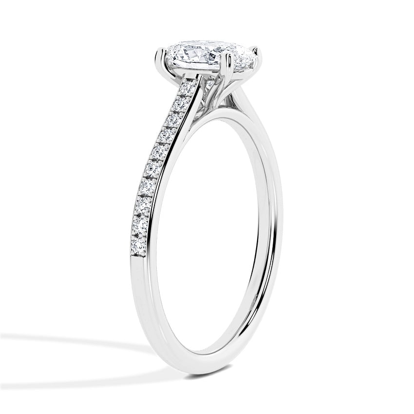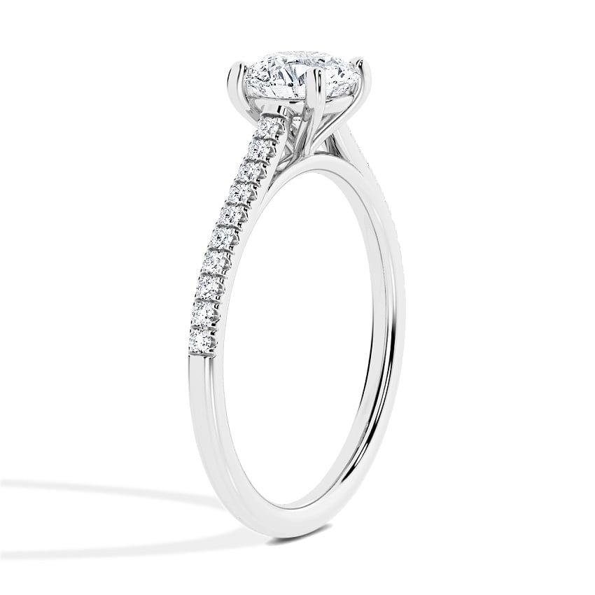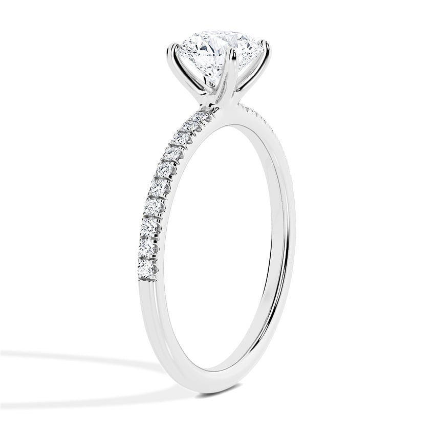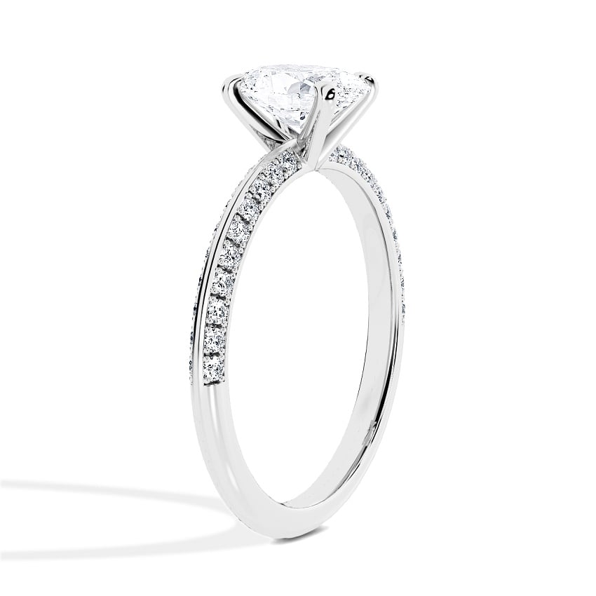 Pavé rings can have an eternity style, where the gems encircle the entirety of the ring or can stop mid-way for a half pavé ring. They can also feature teeny tiny diamonds for a micro pavé or larger gems, based on your preference. Regardless of the style you choose, pavé engagement rings look stellar with any center stone, from elongated diamond shapes to more concentrated cuts with a high degree of brilliance. Combined with the diamonds lining the band, this results in additional amounts of light returned for an extra sparkly engagement ring that will be treasured forever.