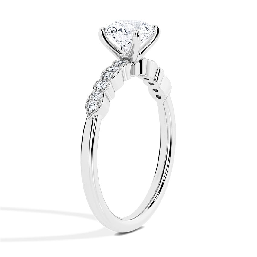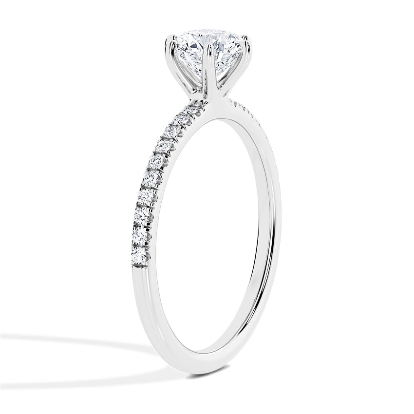On the other hand, prong settings involve small pieces of metal that extend up from the base of the ring and secure to the crown of a diamond to keep it from moving around. Prong settings are a very classic option when it comes to engagement rings and generally have three to six prongs, depending on the shape and size of the stone. However, because they stick out from the ring, prongs can snag on clothes more easily than pavé settings.